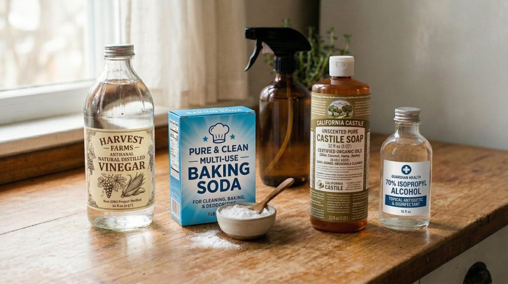 You do not need 15 different bottles for 15 different surfaces. That is a marketing myth designed to sell more plastic. Most of your home can be cleaned with four basic ingredients: Distilled White Vinegar, Baking Soda, Castile Soap, Rubbing Alcohol, and essential oils (optional).