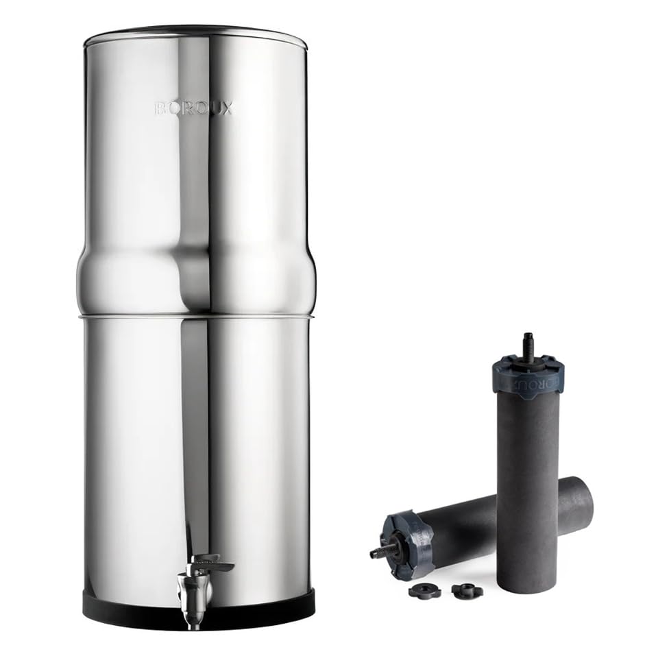 2. What is the best water filter non plastic option? The BOROUX Legacy Gravity System is widely considered the best non-plastic water filter. It is constructed entirely of 304 stainless steel, including the spigot, ensuring your water never touches synthetic materials.