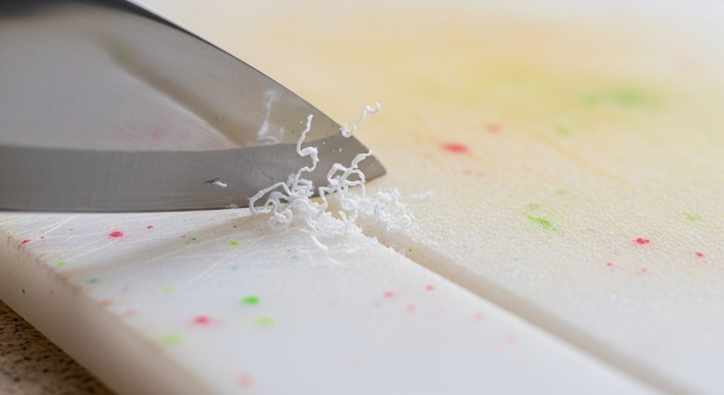 Every night, as we prep dinner, we take a sharp knife and hack away at a slab of polyethylene or polypropylene. We are literally carving microscopic shrapnel directly into our onions and peppers.